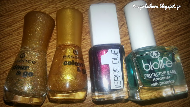 Αγόρασα 2 χρυσές όζες από την Essence, την 157 my fortune cookie και 121 gold fever, πολύ καλής ποιότητας βερνίκια για την τιμή τους, γύρω στα 2 ευρώ. Από Erre Due πήρα αυτό το μεταλλικό βερνίκι που μου φαινόταν μπορντώ αλλά τελικά στα νύχια φαίνεται ένα σκούρο μωβ μελιτζανί και μόνο στο φως λάμπει κάτι κόκκινο και είναι το 405 Wild plum. Από Biolife πήρα μια προστατευτική βάση με πρωτείνες που έιχα ξαναπάρει στο παρελθόν και μου αρέσει πολύ.